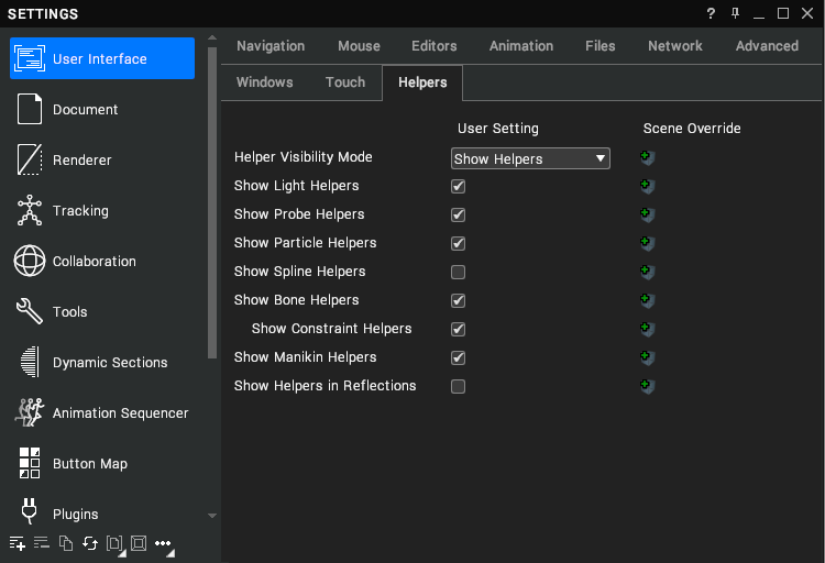 Helpers can be enabled or disabled using the Manikin Helpers option from the Toolbar (they are enabled by default) or via the Settings > User Interface > Helpers window.