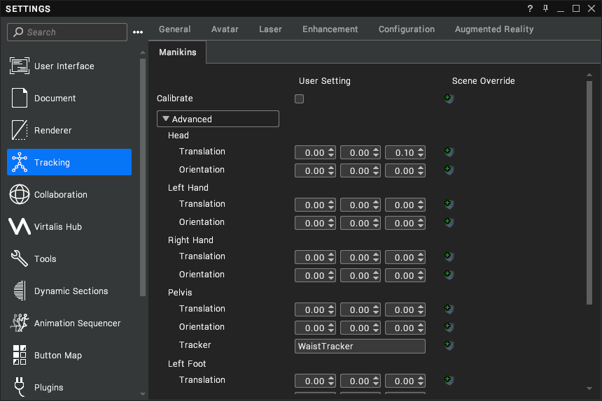 You can edit manikin settings under Settings > Tracking > Manikins. This page enables you to calibrate your tracking system if you are immersed (which can also be accessed via the immersive context menu). The Advanced drop-down contains translation and orientation offsets to apply to various body parts.